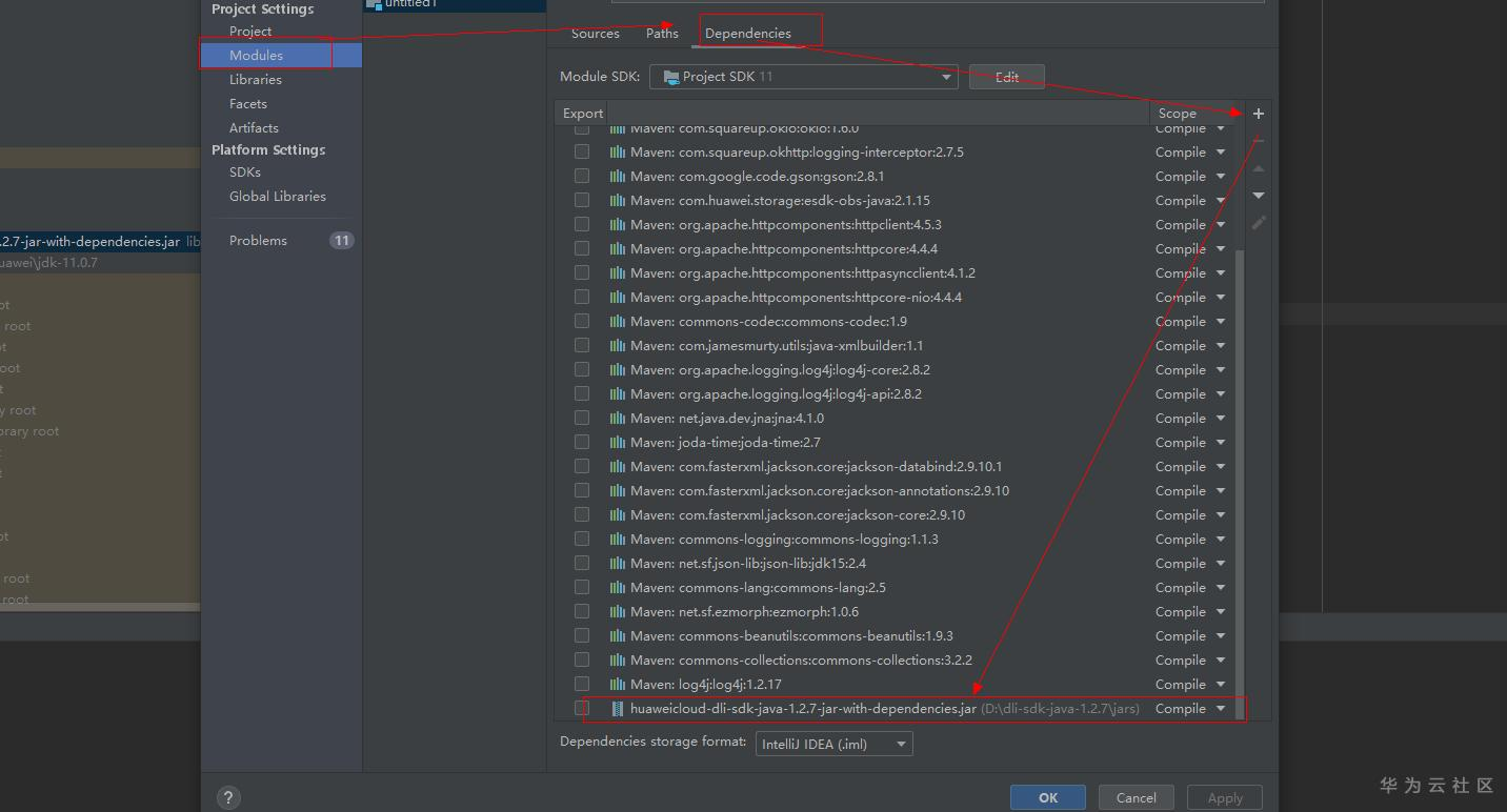 IDEA先建一个JAVA工程,需要导入DLI SDK依赖包,DLI依赖包在官网(https://uquery-sdk.obs-website.cn-north-1.myhwclouds.com)可以下载,把上述下载的依赖包解压之后获取huaweicloud-dli-sdk-java-{版本号}-jar-with-dependencies.jar包通过IDEA菜单依次点击File -> Project Structure->Modules->Dependencies进行导入,成功导入之后,我们就可以着手写第一个DLI SDK DEMO了。