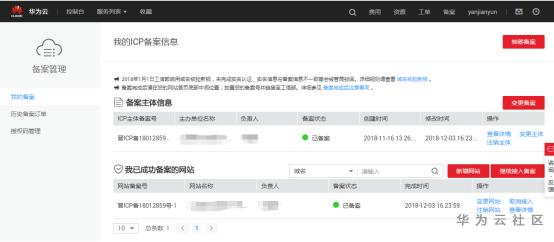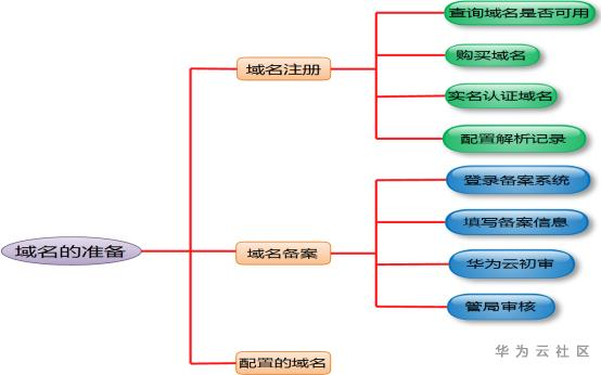 域名注册及配置:对于需要域名的可以去华为公有云官网注册域名,因为好多域名已经被注册,需要先查询下该域名是否已使用,对于未注册的域名就可以购买了。对于域名的备案根据华为官网的指示流程来提供所需资料即可,具体流程参见如下: