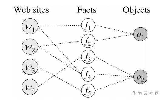 单值属性有唯一的属性值,根据这一性质可以利用投票的方法得到最有可能的结果。图3提出了一种基于异构信息网络的真值发现方法,异构信息网络中构建了三类节点,第一类节点为知识图谱,第二类节点为三元组事实,第三类节点为对象(即三元组中的实体-属性对)。每个知识图谱都存在大量的三元组,这些三元组的平均准确率决定了知识图谱的质量,而知识图谱的质量也可以用来估计三元组的准确率。当一个对象存在多个属性值时,如果大多数高质量的知识图谱都支持其中某一属性值,那么这个属性值很可能就是这个对象的真值。