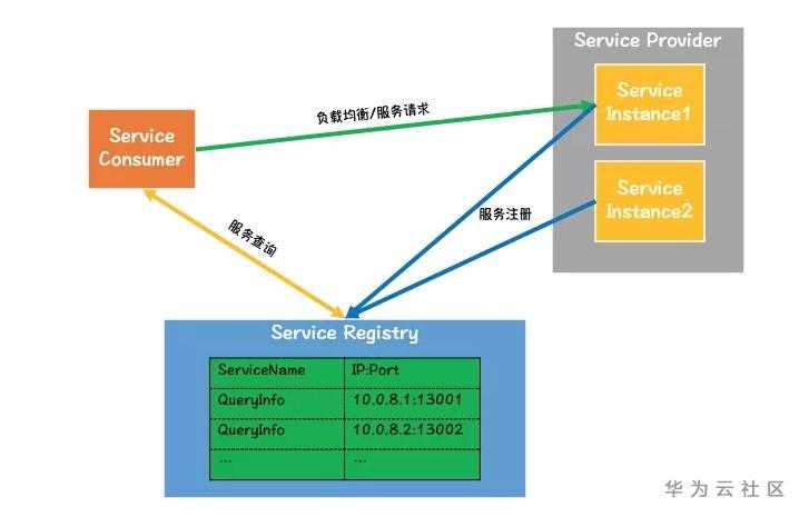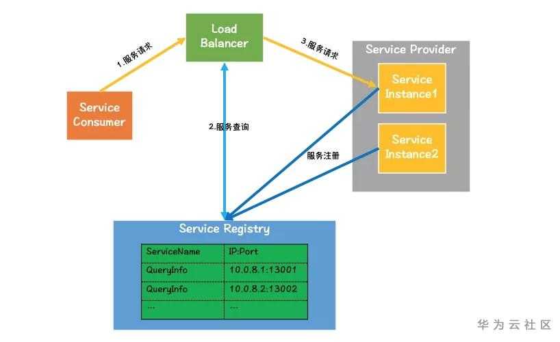 发现:服务消费者通过负载均衡器发送服务请求,负载均衡器会查询服务注册表,挑选一个服务实例,并将请求转发到服务实例。