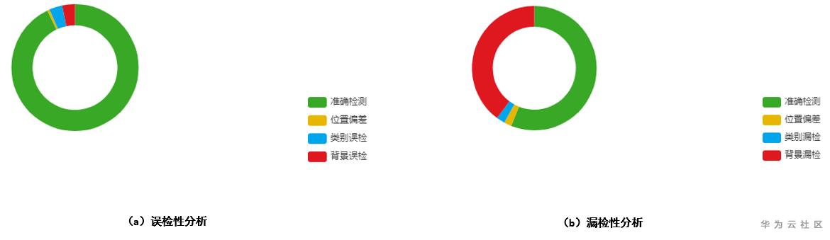 在目标检测的模型评估阶段,目标检测的假阳性(误检分析)以及假阴性(漏检分析)是比较重要的一环,在假阳性分析方面,位置误差主要表现在位置误检概率,在假阴性分析方面,位置误差主要表现在位置漏检概率,ModelArts中对应的模型评估结果展示为: