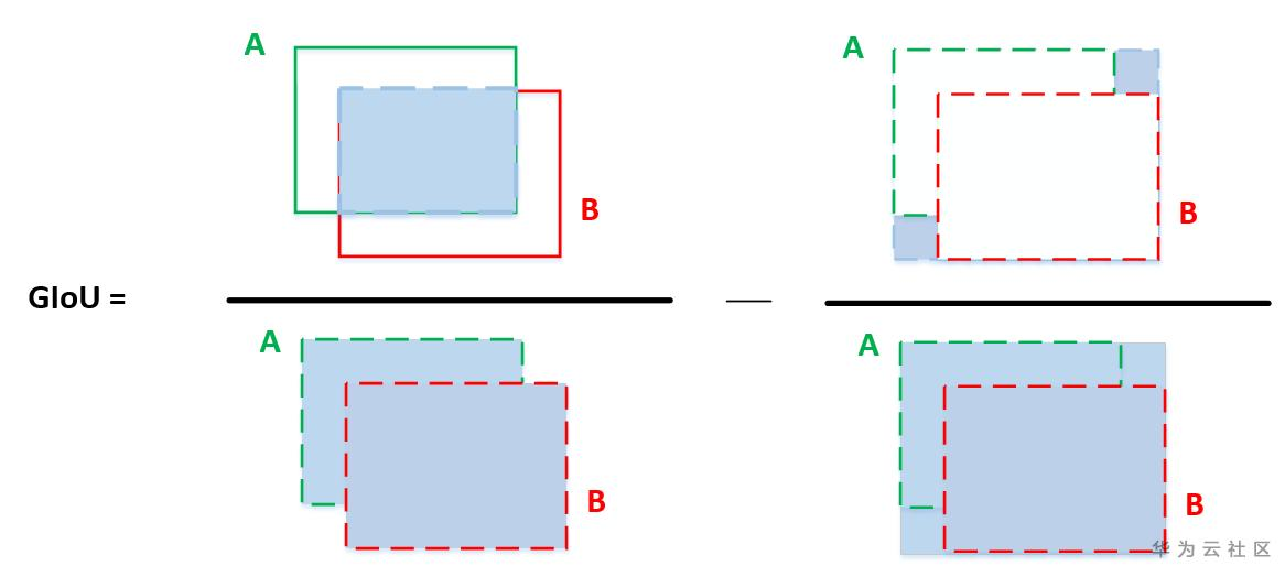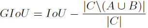 计算GIoU的公式如下,其中A代表预测框,B代表目标框,C代表A和B最小的公共面积区域。