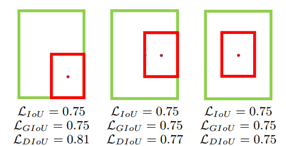 (2)在GIoU loss不能回归的场景,例如目标框包含预测框的情况(下图所示),也能快速的回归bbox。