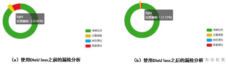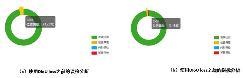 使用DIoU loss之前和之后在漏检分析(假阴性)的对比情况,可以看出,使用DIoU loss之后,位置偏差得到比较大的改善。