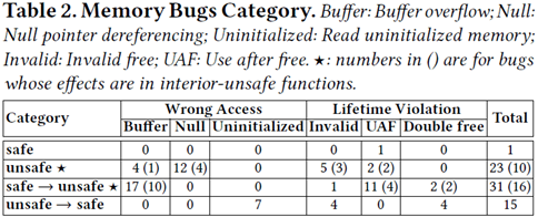 这项研究调查了70个内存安全问题。针对于每个问题,研究者仔细的分析了问题出现的根因(cause)和问题导致的效果(effect)。问题根因是通过修改问题时提交的patch代码来界定的——即编码的错误发生在哪儿;问题的效果是指代码运行造成可观察的错误的位置,比如出现缓冲区溢出的代码位置。由于从根因到效果有个传递过程,这两者有时候是相隔很远的。根据根因和效果所在的代码区域不同,研究者将错误分为了4类:safe -> safe、safe -> unsafe、unsafe -> safe、unsafe -> unsafe。比如:如果编码错误出现在safe代码中,但造成的效果体现在unsafe代码中,那么就归类为safe -> unsafe。