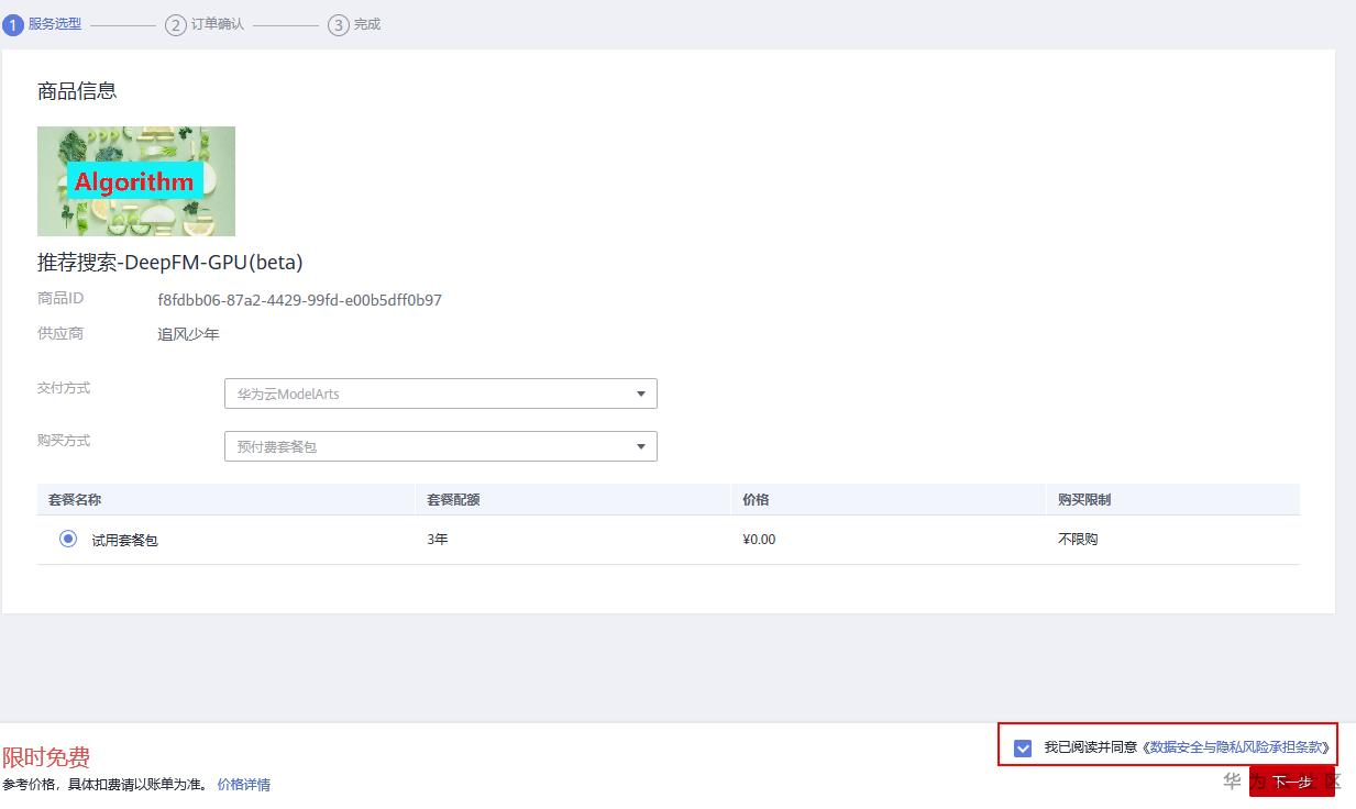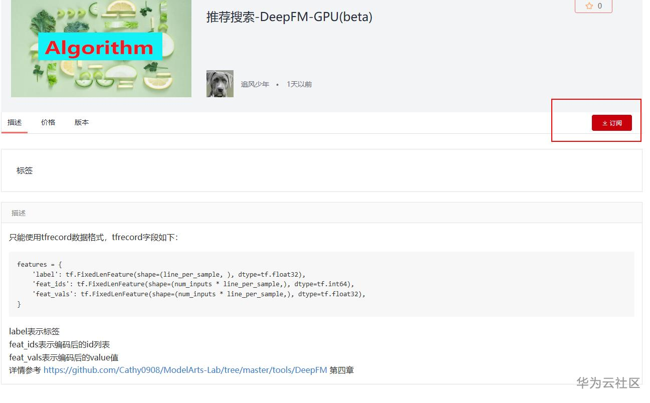 点击订阅后进入订阅页面,注意 此页面有算法的描述信息