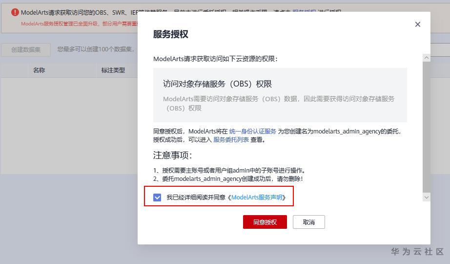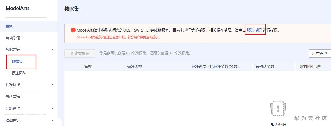 进入数据集管理页面,进行服务授权,如果没有这个提示代表不需要进行授权可以跳过。