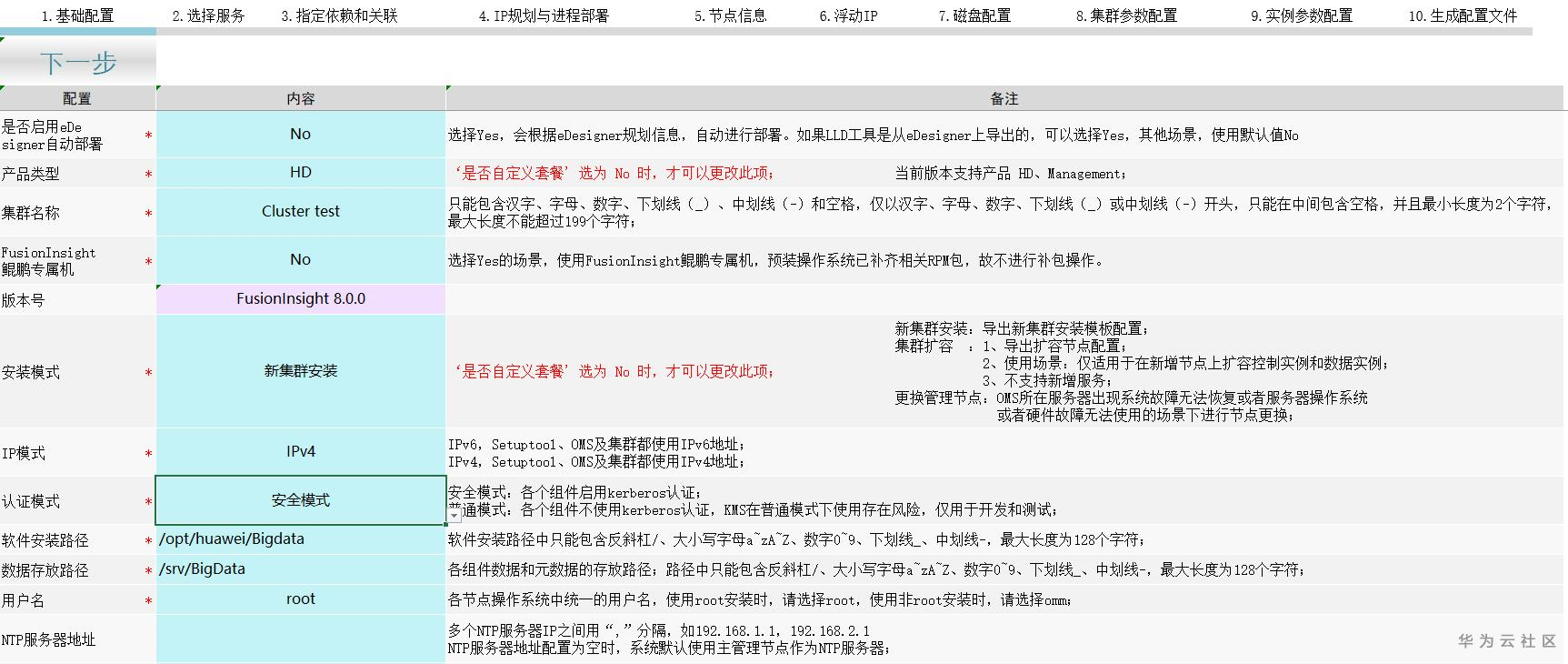基础配置主要需要设置集群名称、集群安装模式、集群IP模式、软件安装路径、数据存放路径、集群操作系统信息、配置文件输出路径信息等
