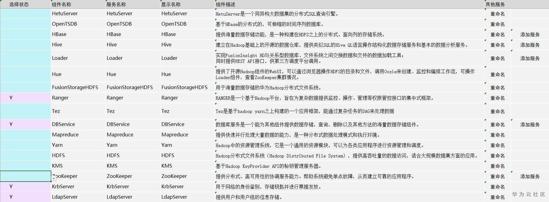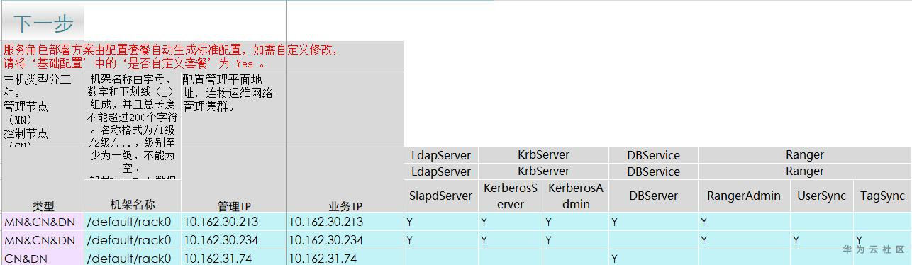 选择服务页面用来指定集群所部署服务种类(勾选Y表示部署该服务),目前默认部署Ranger、DBService、KrbServer、LdapServer服务