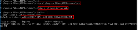 打开windows命令行窗口,进入到MIT安装目录(如: C:\Program Files\MIT\Kerberos\bin),使用keytab文件进行认证,并查看认证信息是否正确以及认证缓存文件是否生成。