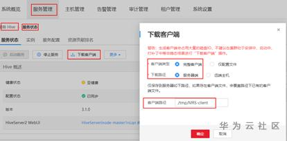 4) 在MRS Manager页面下载Hive客户端,解压后获取hive客户端jar包(如:/tmp/MRS-client/MRS_Hive_ClientConfig/Hive/Beeline/lib),并上传至windows虚机。