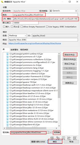 然后点击添加文件,将之前上传的hive客户端的jar包添加进来,点击找到类,选中hive驱动类。最后点击测试连接并查看库中的表信息。