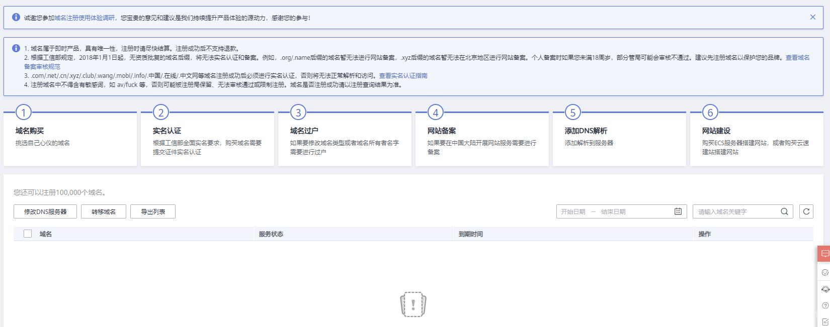 域名注册方面,用户可以选择在华为云购买域名,也可以在第三方购买域名,并且都可以使用华为云的解析服务,个人还是比较推荐后买华为云的域名的,有保障一些。