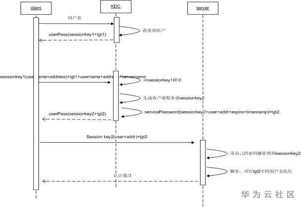 • 1. 用户开始登录,输入用户名,KDC收到用户名,在用户数据库中查找这个用户,结果发现了这个用户。