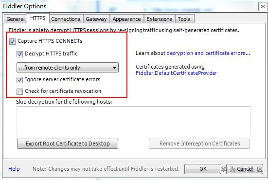 双机打开fiddler软件,菜单栏Tools->fiddler options打开配置页面,参考如下截图完成fiddler服务器侧的配置