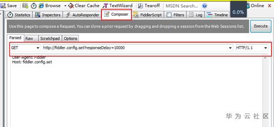 菜单栏Rules->Customize Rules导入js脚本,打开Composer,如图输入http://fiddler.config.set?responseDelay=10000(10000单位是ms),点击Execute按钮。可以根据需要修改参数值,设置终端收到响应的时延,方便快捷