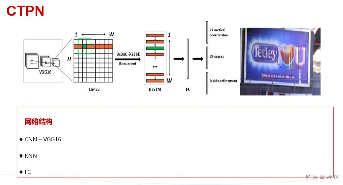 划知识点了(加粗表示):CTPN网络结合了CNN与LSTM深度网络,通过固定宽度 的anchor提取proposal,能有效的检测出复杂场景的横向 分布的文字区域,不定长度文本识别效果较好,是目前 使用广泛的文字检测算法。