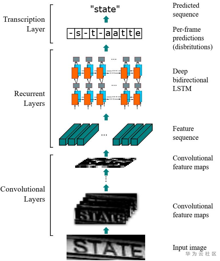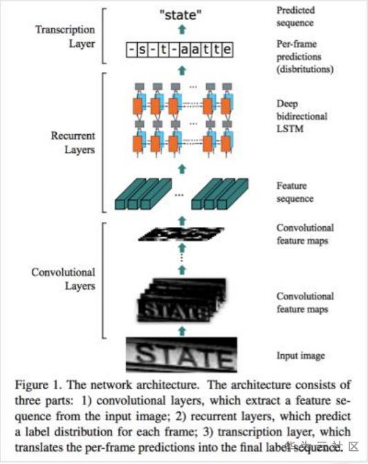 图内分为三个过程:卷积层提取特征,循环层深度双向LSTM,转录层将RNN输出做softmax。