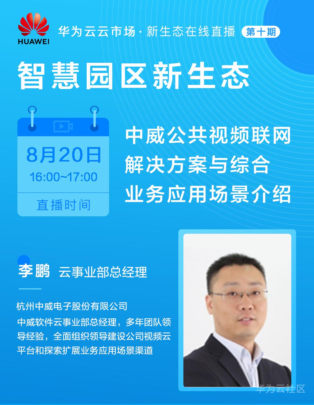 8月20日,中威电子云事业部总经理李鹏将在华为云云市场直播间中为大家带来一场精彩的主题分享——《携手AI视频云,共创行业价值》,欢迎广大朋友届时前来观看直播,一同探讨目前AI视频云商业契机和解决方案!
