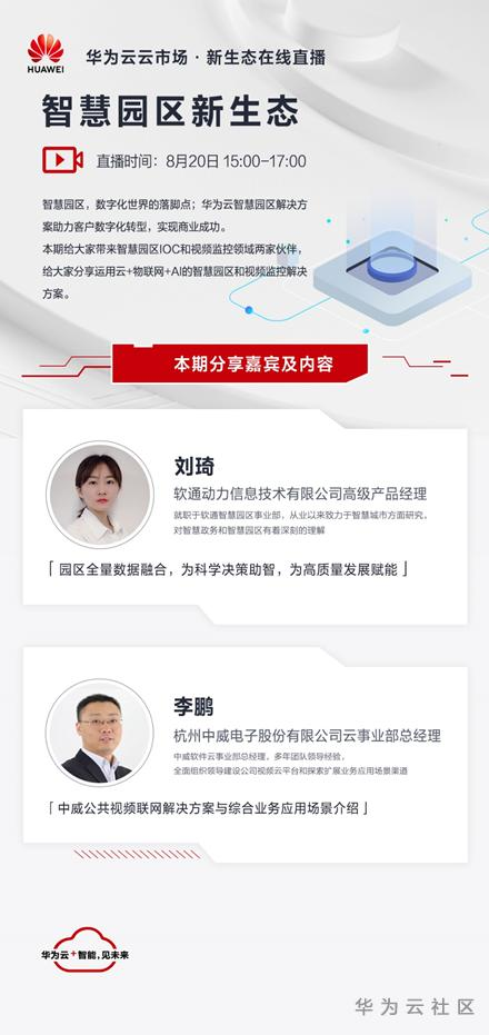 如何运用云、AI、IoT等技术打造全量数据融合、协同统一的智慧园区?如何通过“端、边、云”实现公共视频资源汇聚与视频智能分析?“华为云云市场 · 新生态在线直播系列活动第十期《智慧园区新生态》” 为您揭晓!本期话题,华为云将携手软通动力、中威电子的二位行业大咖齐聚一堂为您带来精彩演讲,分享智慧园区解决方案和公共视频联网解决方案在综合业务场景中的应用。