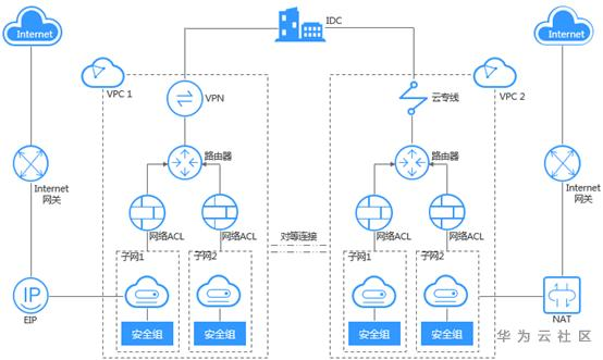 因VPC具有区域属性,默认情况下,不同区域的VPC之间内网不互通,同区域的不同VPC内网不互通,同一个VPC下的不同可用区之间内网互通。子网规划、路由策略、弹性公网IP、NAT网关、安全组、网络ACL、VPC对等连接、权限等问题导致网络不通。
