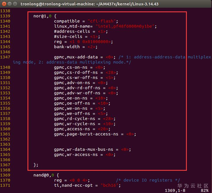 按照下图方法,在打开的设备树源文件“nor@1,0”节点中配置GPMC的时序: