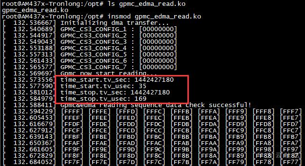 执行如下指令加载gpmc_edma_read.ko驱动模块,由下图可见使用EDMA连续读取到的数据从FFFF递减1到F000: