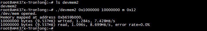 以上命令的作用是:向物理地址0x01000000中,写入长度为10000000字节数据0x12,然后将其读取出来,从而获得读写速度以及错误率。读写时,使用"memset/memcpy"函数。