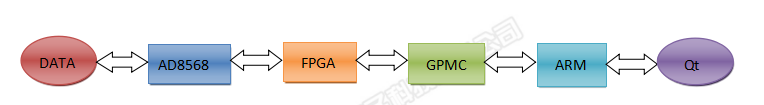 例程实现的功能是:FPGA控制AD8568进行数据采集,再将采集到的数据通过GPMC总线送到ARM端,ARM端使用运行Qt显示采集到的信号波形。整个过程的流程示意图大致如下: