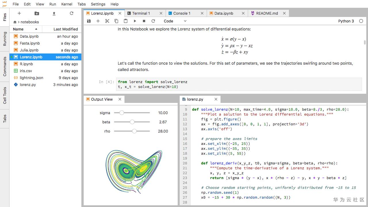 通过使用JupyterLab,能够以灵活,集成和可扩展的方式处理文档和活动,对于Jupyter Notebook有着完全的支持,JupyterLab的出现在某种意义上是为了取代Jupyter Notebook,将成为开发者们下一阶段更主流的开发环境。