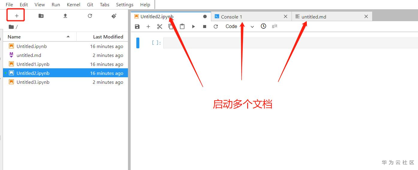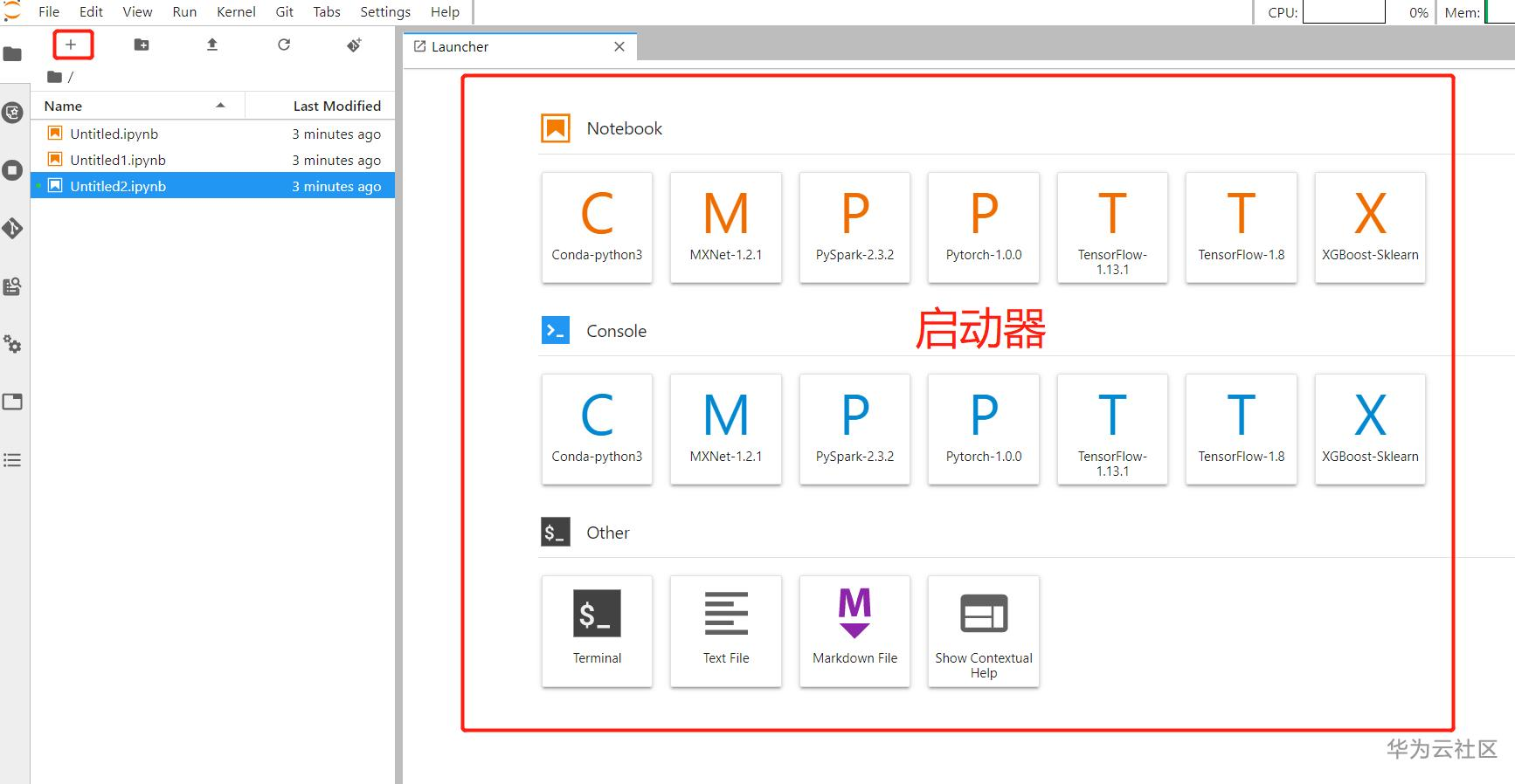 右侧的选项卡称为启动器,你可以新建notebook、console、teminal或者text文本。当你创建新的notebook或其他项目时,启动器会消失。 如果您想新建文档,只需单击左侧红圈里的“ +”按钮。