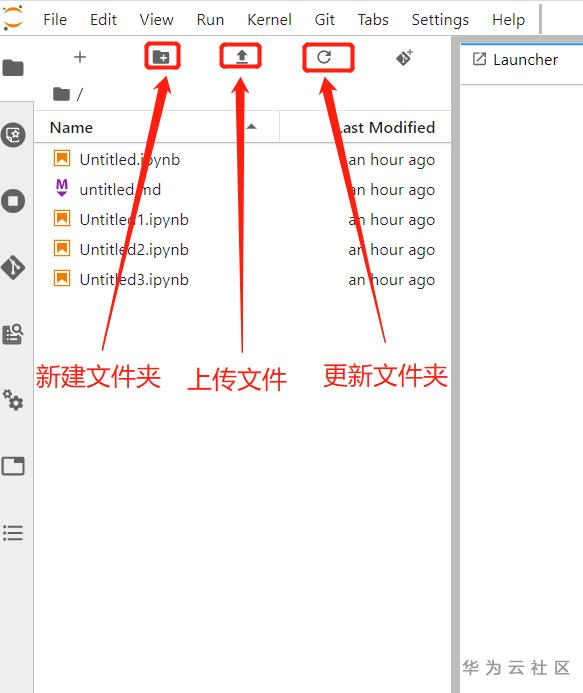 进入JupyterLab页面后,可以单击左上角“Upload”快捷键,从本地选择一个文件上传。