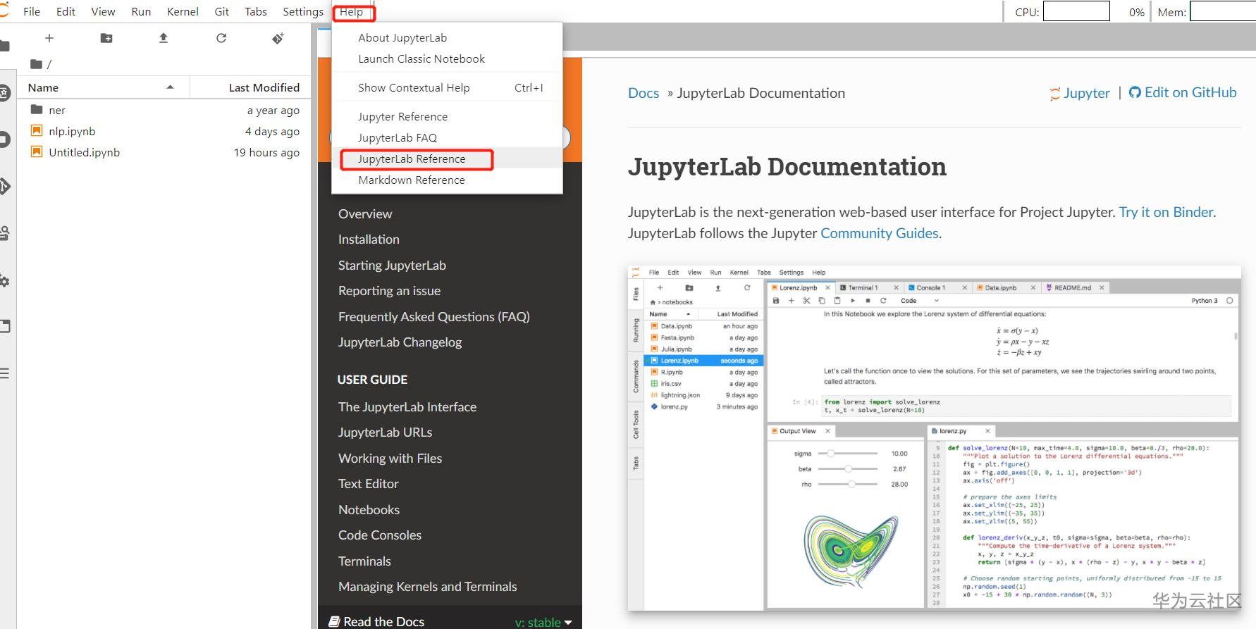 更多的关于JupyterLab的使用可参考ModelArts的帮助文档介绍,或者在“help”中打开官方文档学习。