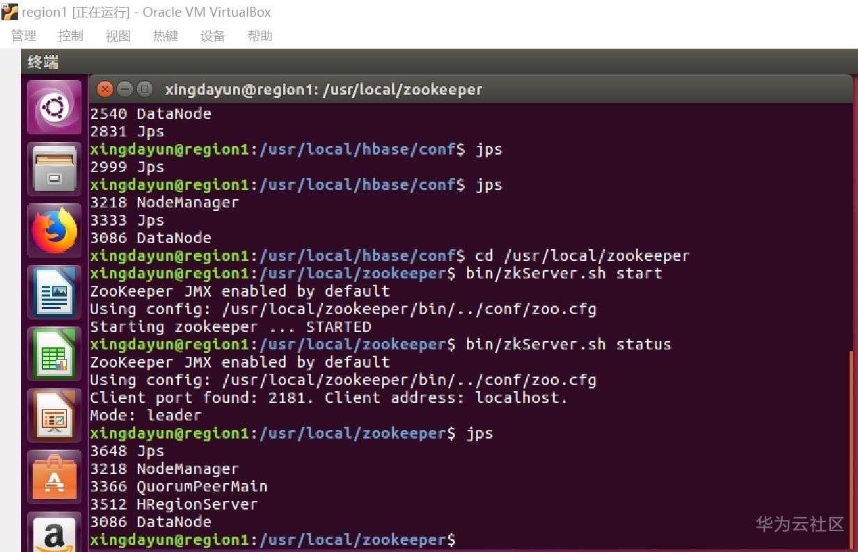 $ cd /usr/local/zookeeper #在master、region1节点执行