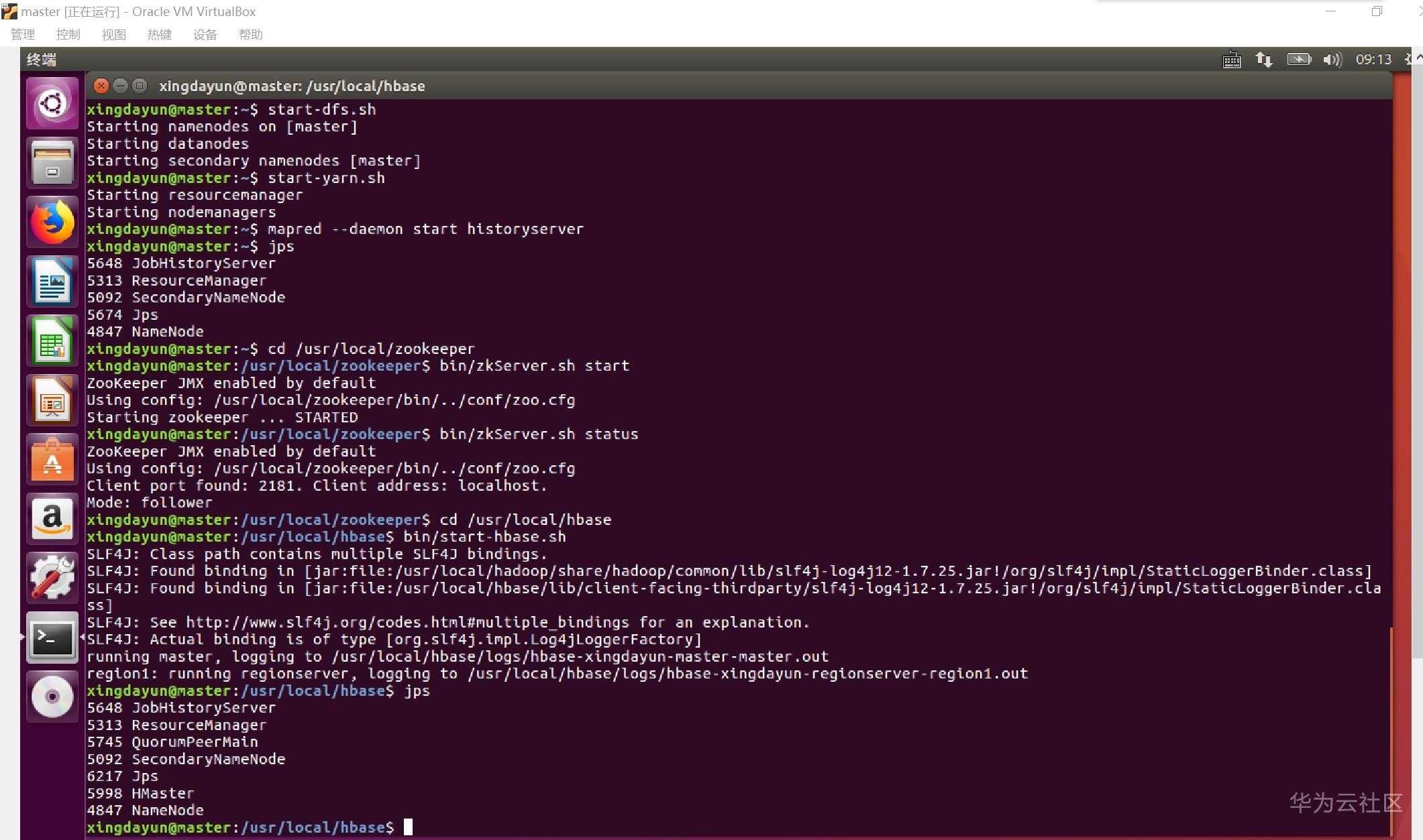 在master节点使用bin/start-hbase.sh启动,用jps查看节点状态,master中有HMaster、region1中有HRegionServer则为成功搭建HBase分布式集群。