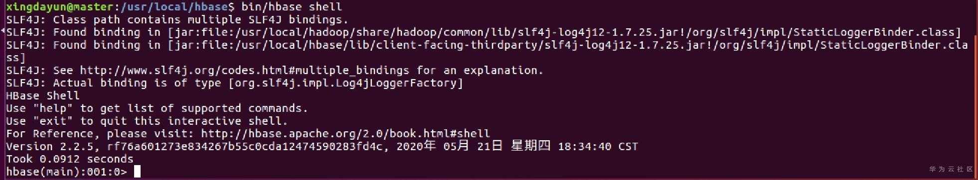 执行“bin/hbase shell”命令可进入HBase Shell模式。