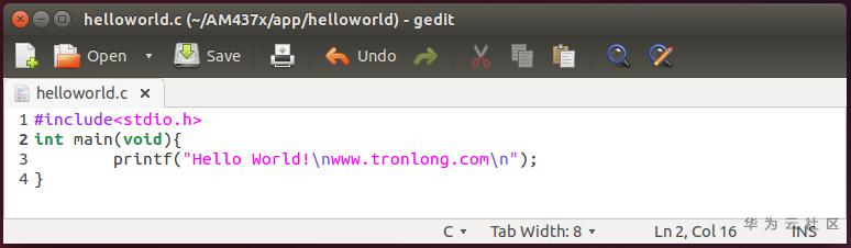 使用gedit工具新建helloworld.c文件,并编辑程序源码。新建helloworld.c文件的命令如下: