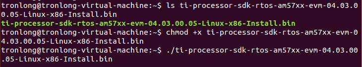 将光盘“Tools\Linux-RT\ti-processor-sdk-rtos-am57xx-evm-04.03.00.05-Linux-x86-Install.bin”开发包拷贝到Ubuntu,执行如下指令安装RTOS Processor-SDK:
