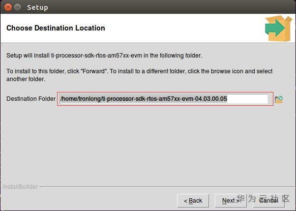 进入安装目录选择界面,将“/home/tronlong/ti”默然安装目录修改为“/home/tronlong/ti-processor-sdk-rtos-am57xx-evm-04.03.00.05”,也可以根据实际情况选择安装路径。如下图所示: