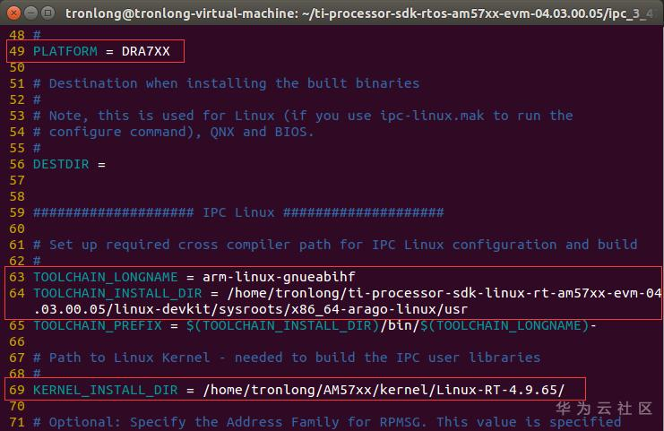 64 TOOLCHAIN_INSTALL_DIR = /home/tronlong/ti-processor-sdk-linux-rt-am57xx-evm-04.03.00.05/linux-devkit/sysroots/x86_64-arago-linux/usr //Linux-RT交叉编译链