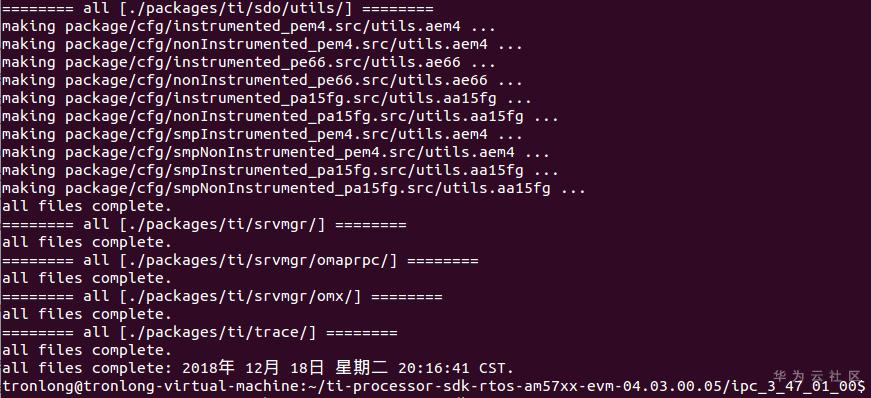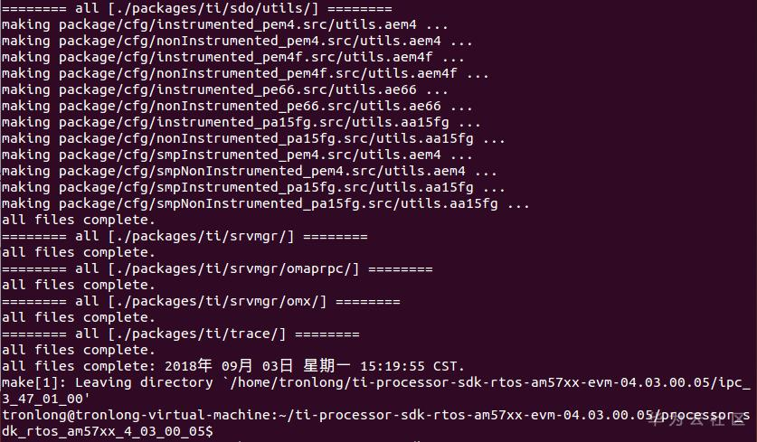 按照前面步骤配置好RTOS Processor-SDK环境变量,如需编译整个RTOS Processor-SDK开发包,可进入processor_sdk_rtos_am57xx_4_03_00_05目录下执行以下命令编译。实际开发中一般无需编译整个RTOS开发包,只编译需要用到的RTOS组件即可。