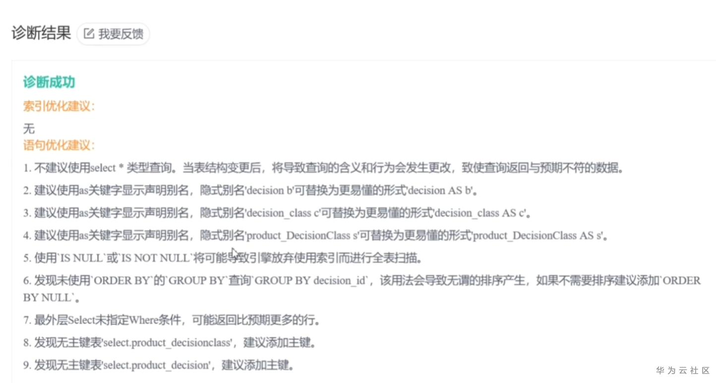 目标:用华为云数据库诊断一下我们上面的这个SQL 是否存在性能问题,以方便我们开发有针对性的优化这个问题哦