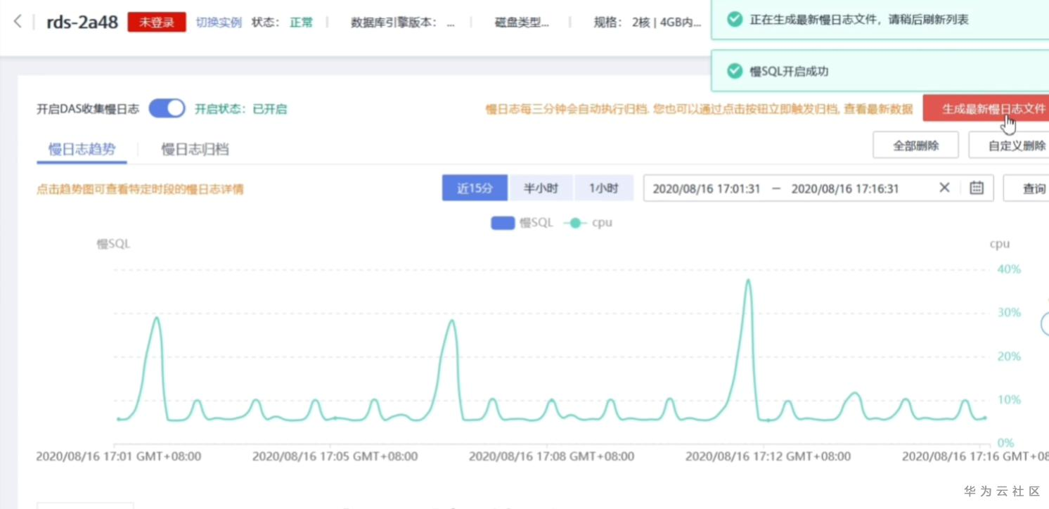 除此之外还有一个就是慢查询日志,这个功能在云DBA中,需要开启DAS收集慢日志的功能。