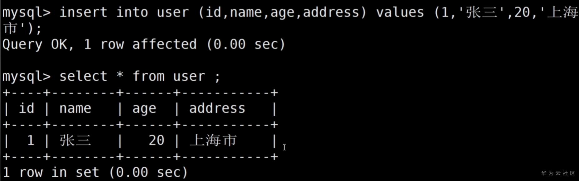 insert into user (id,name,age,address ) values (1,'张三',20,'上海市浦东新区') ;