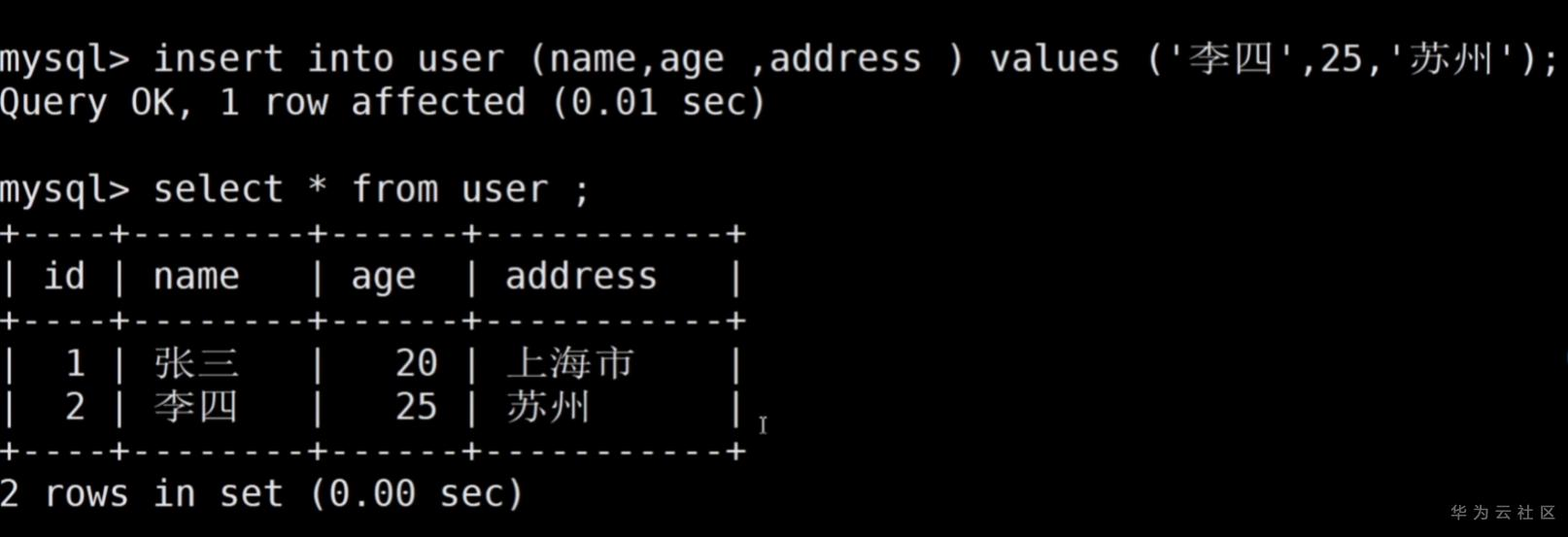 insert into user (name ,age ,address) values ('李四',25,'上海市徐汇区');