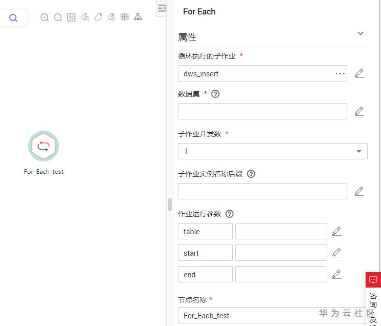 在1中介绍了For Each算子的参数,在配置For Each算子的时候,首先要定义一个循环运行的子作业。在本次操作中,定义循环执行的是一个包含了DWS SQL节点的任务: