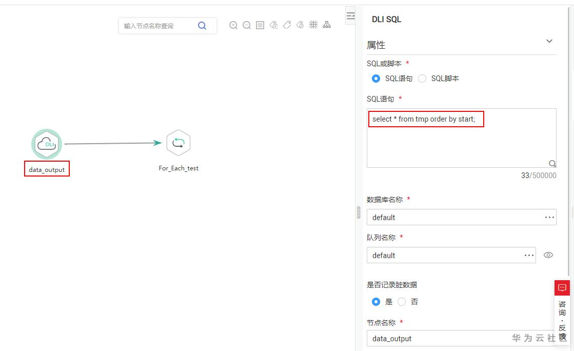在准备好子作业和数据集后,就可以配置For Each算子了。新建一个数据开发任务,首先定义DLI SQL节点,负责读取临时表中的内容作为数据集: