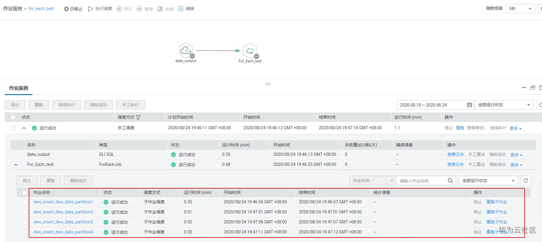 配置好For Each节点任务后,点击保存后并测试运行,然后点击“前往监控”,就可以查看作业的运行情况: