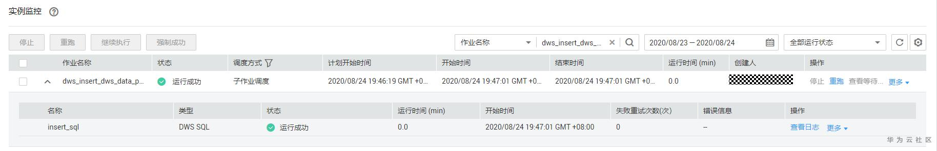 可以看到红框中,在子作业的DWS SQL中定义的变量已经被替换为数据集第一行的数据。同理,第二个子作业实例的变量对应的是数据集的第二行数据。也就对应了上文所说的,数据集中的一行数据会产生一个子作业实例。