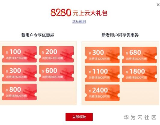 (1)每位用户可获得固定总额的“上云礼包”(即华为云优惠券);